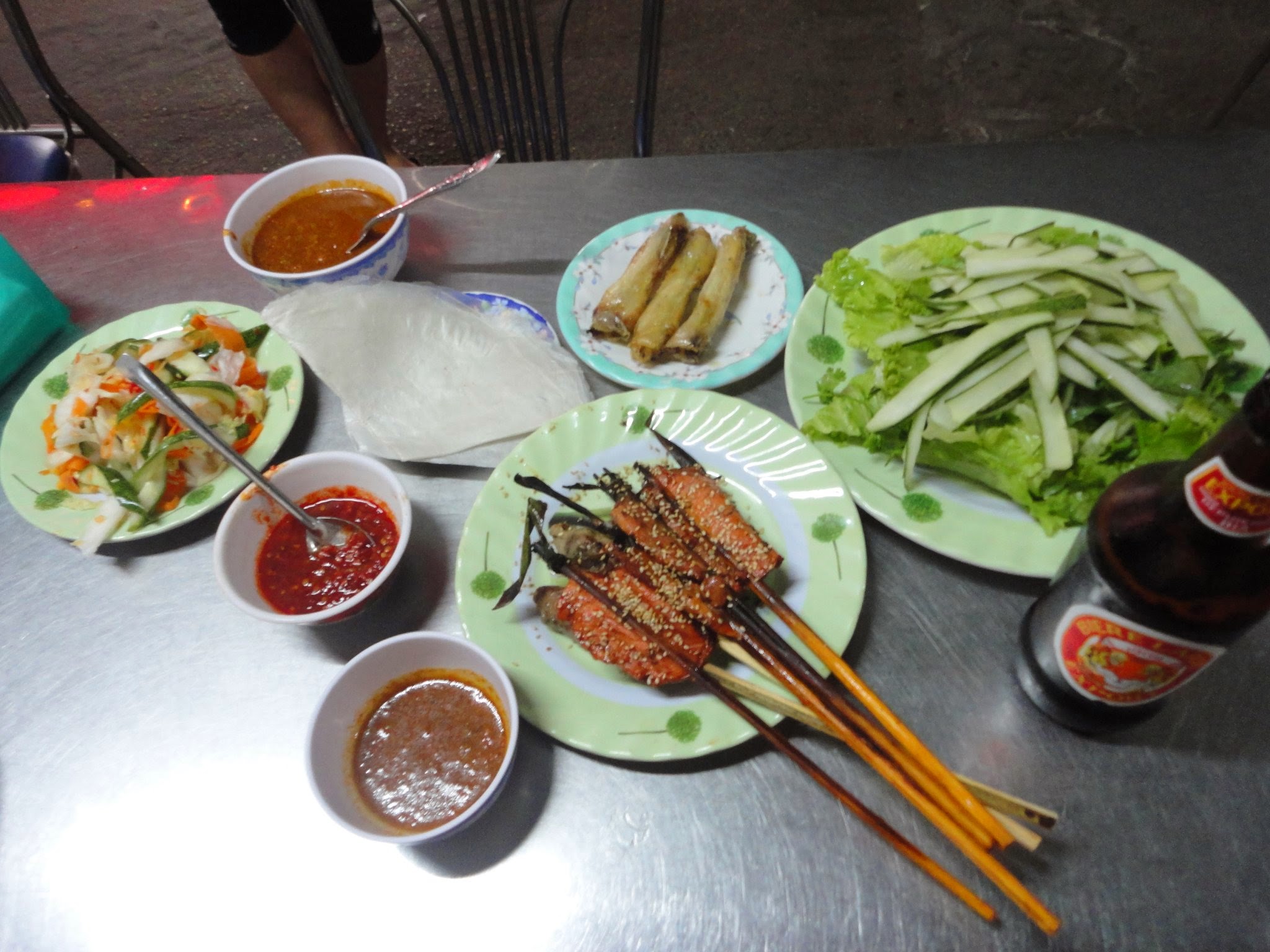 I had searched a few times for this place, and couldn’t find it. Then, as always, when wandering lost on my last night, I found it. Lonely Planet recommended it, and with good cause. It’s an outdoor seating, BBQ/family style gem. They offer a SET (as in, only thing you can order) menu for 125,000 dong (6$). It includes a large salad, marinated vegetables, fried spring rolls, two kinds of pork, fried pancakes, rice paper for wrapping and the special sauce. The nice ladies who work the place will help you build a few of your wraps until you can try. Basically, you just put a splash of all the ingredients on the table into the little, clear rice paper wraps, roll, dip and eat. I had been underwhelmed with the amount of street/authentic local food in this tourist haven. This was a place where everyone comes. Your fingers are greasy, beer is condensating, stomach is full and then they bring you a little chocolate or mango mousse with a dollop of whipped cream. The chairs aren’t comfortable enough to make this a place to chill for a long time and hang, but it serves a delicious purpose.