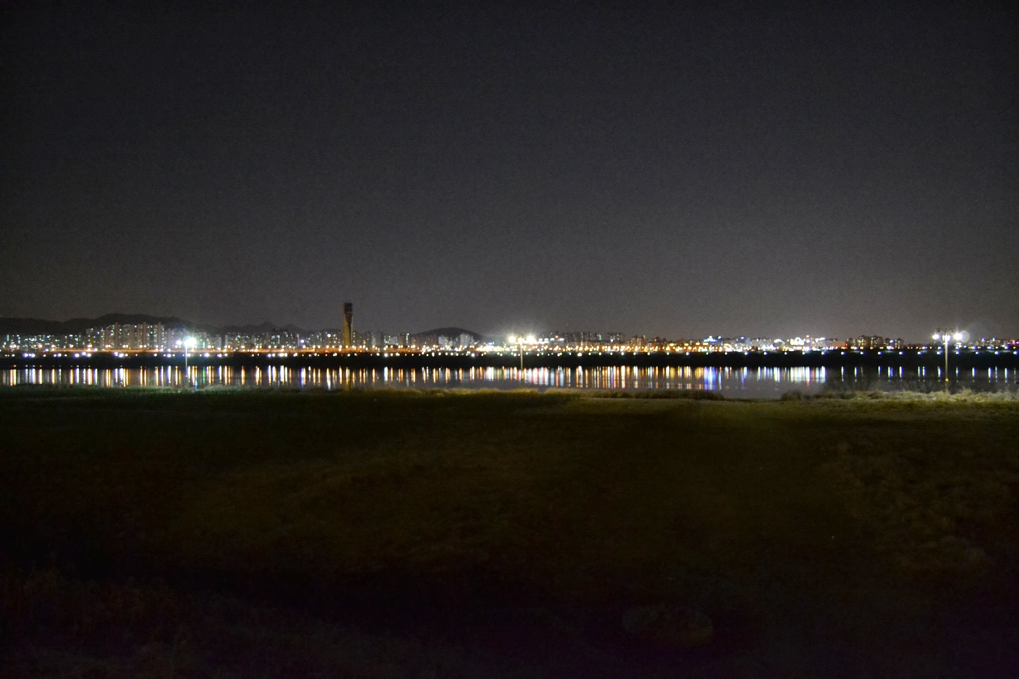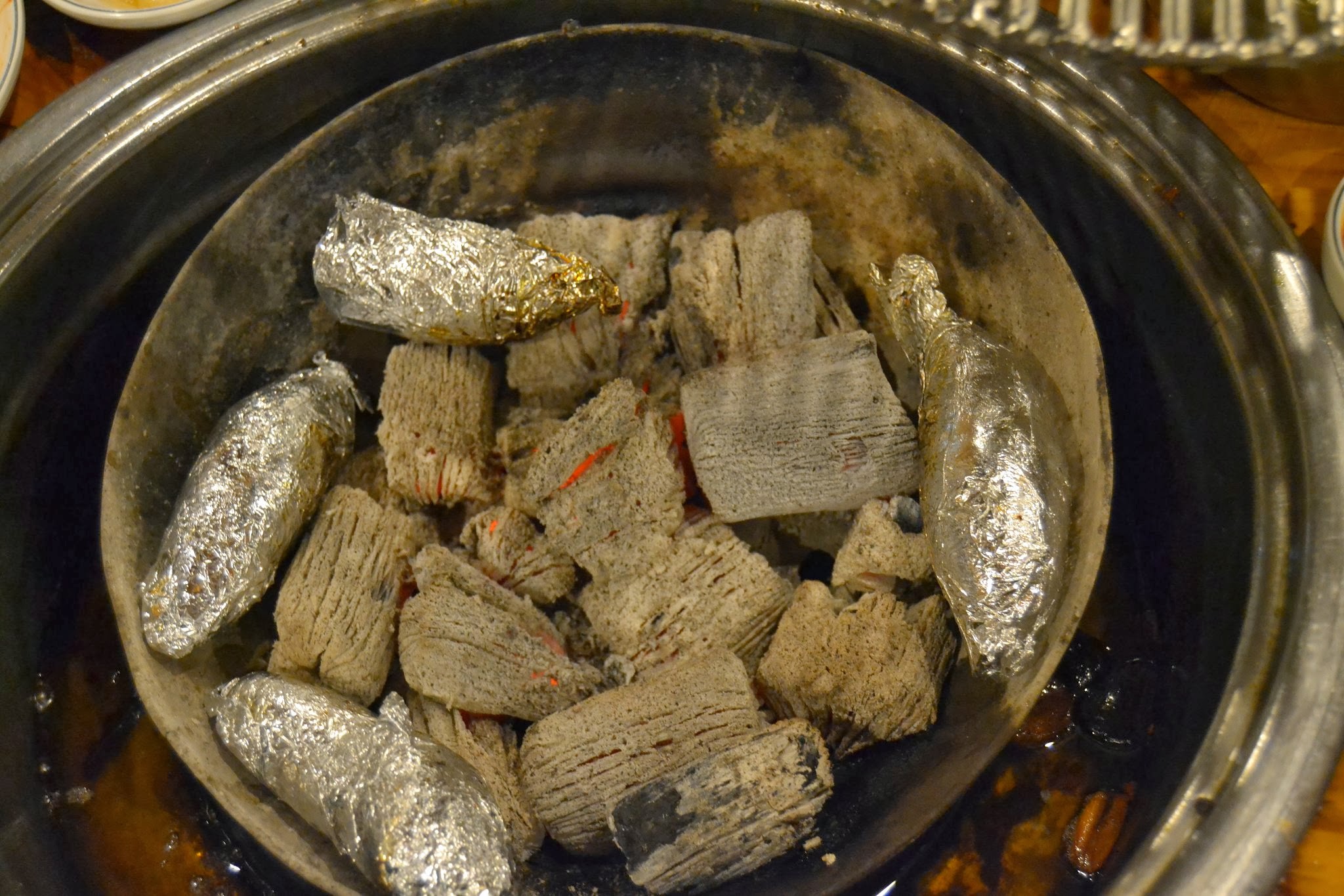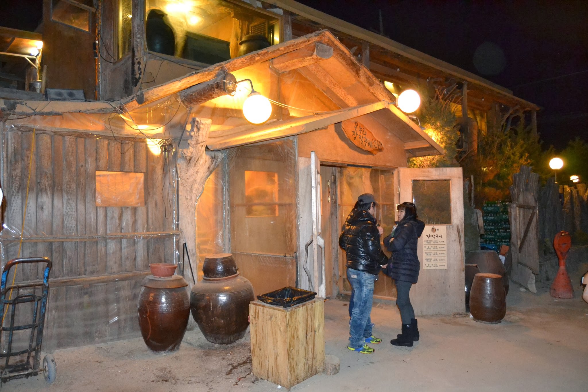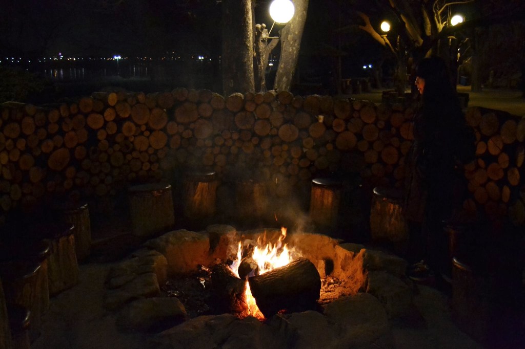 My favorite restaurant in Seoul is not one you can stumble upon by walking through the glittering boulevards or winding city alleyways. It is a big wooden mansion set beside highway 6, east of Guri. Inside is the best duck I’ve ever eaten. For 40,000won, you can get an entire smoked duck, unlimited amounts of noodle soup, rice, kimchi and other side dishes. I realized on my last trip before leaving Korea that when the smoked duck is BBQ’d it gains a flavor similar to a high class hot dog. It’s not the best analogy, but the simple crispiness of duck skin and well charred meat creates a very familiar taste. (And what is more familiar to an American carnivore than a hot dog?) We dip it in a sweet black sauce before adding onion and jalapeno and wrapping it all in a lettuce leaf for a monster bite of delectability. The noodle guksu (thin soup) consists of rice noodle in a mix of seaweed, tofu skins and kimchi. The kimchi tastes homemade and has both varieties–spicy red and original white. There are also sweet potatoes wrapped in foil mixed in among the charcoal cooking as you eat, so don’t forget that starchy little dessert. (As an added bonus, sweet potatoes are put outside in first come first serve manner about twice every hour.) Soju, makkeolli and soda are present on all tables. It’s a place suitable for dates, entertaining, families and discerning foodies. Outside there are at least three fire pits burning with the Han River behind making a peaceful background for digestion after the big meal. Kids run around playing as adults sit sipping cocoa and coffee by the fire. It’s an experience of Korea that is worth the drive.
