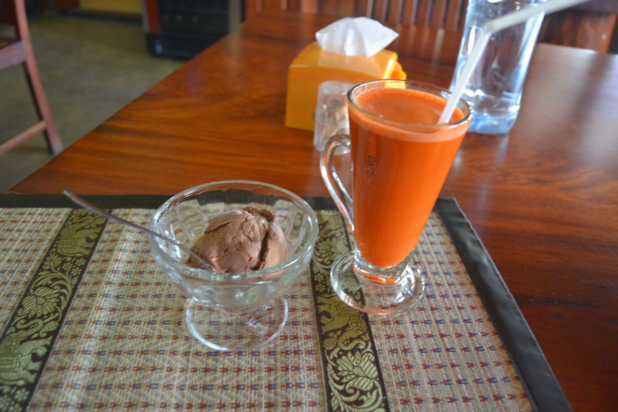 Perfectly blended, sugar free carrot juice with chocolate ice cream dessert. (20,000kip <3US$)