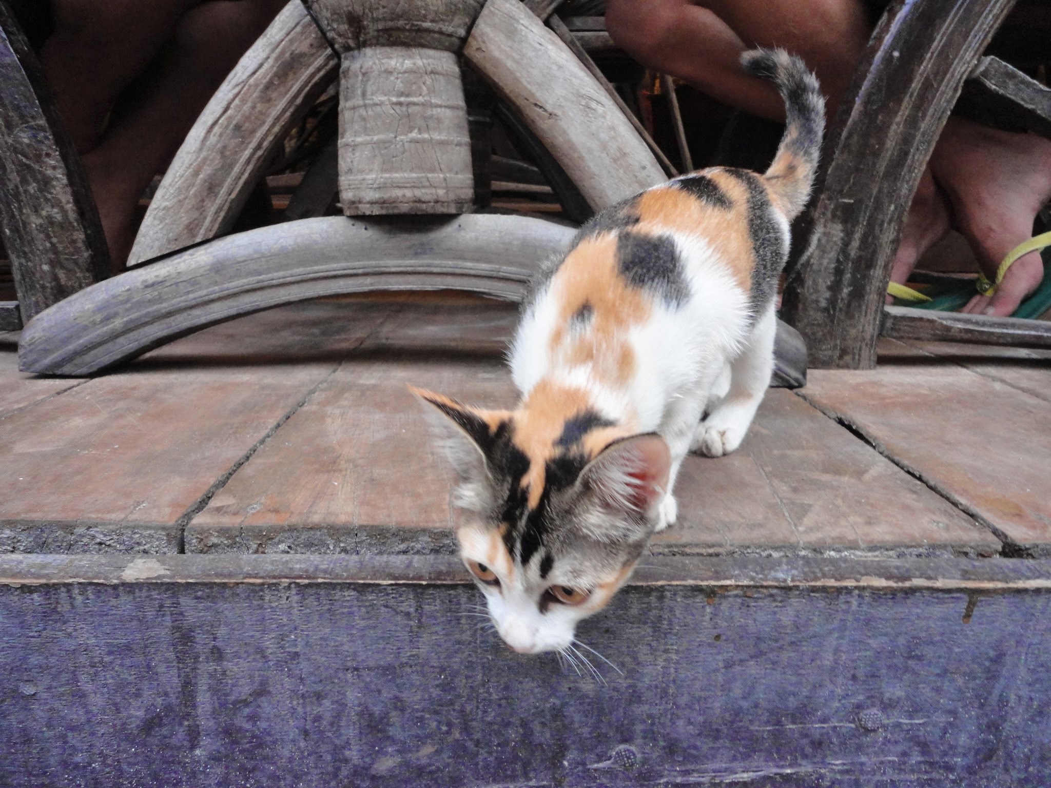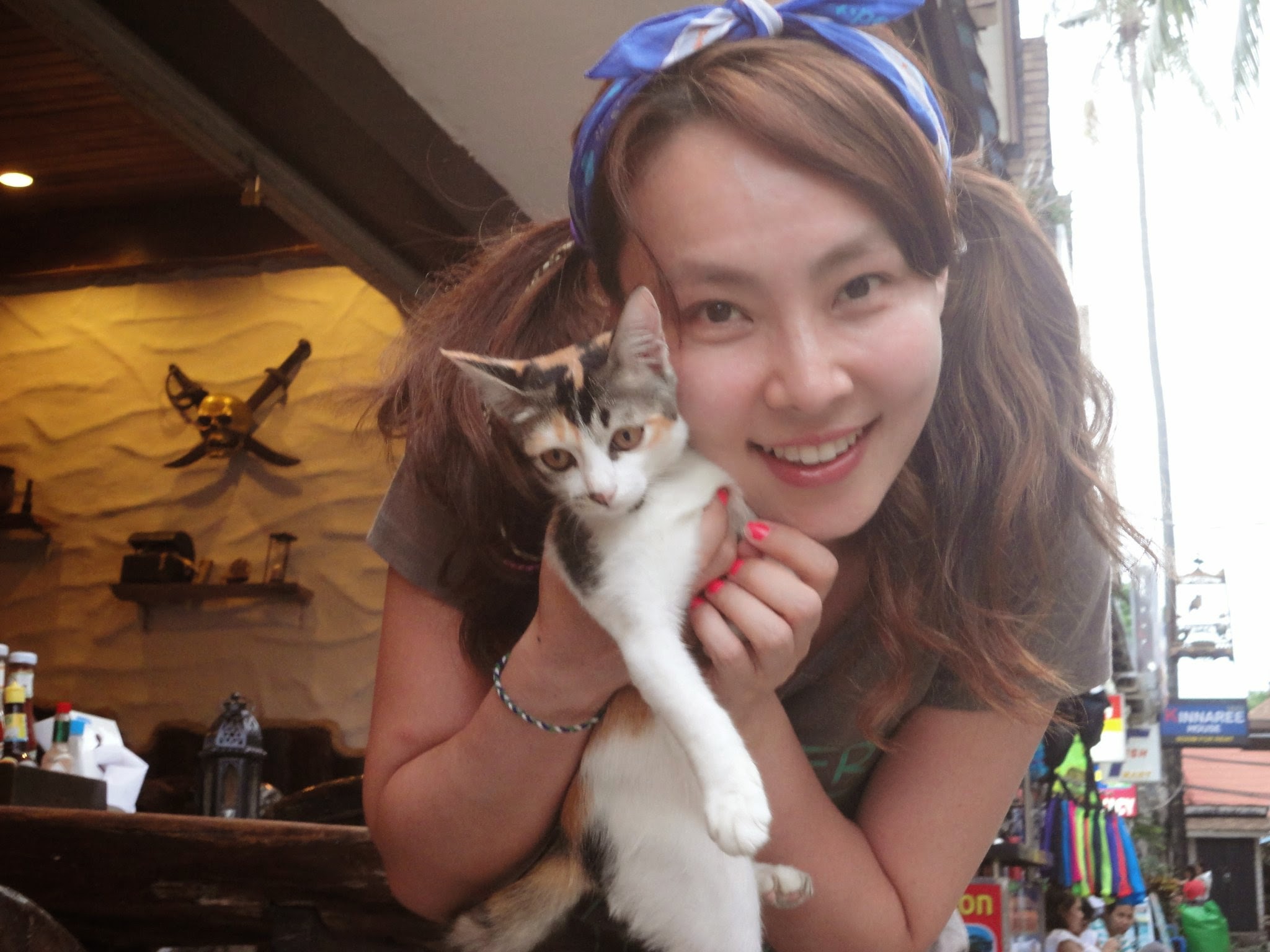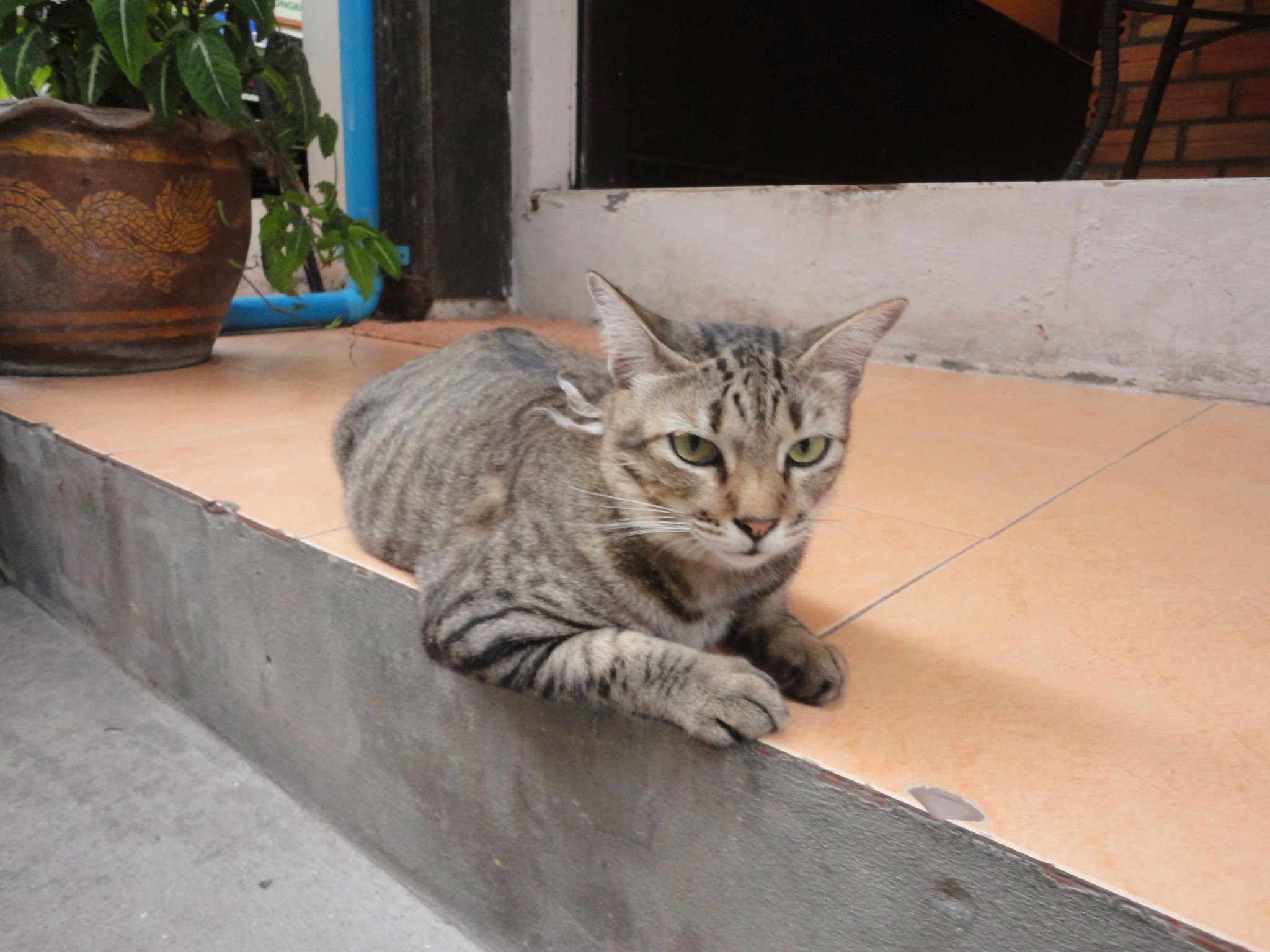 Koh Phi Phi is a spectacular island in the Andaman Sea. It was completely wiped out in the Asian Tsunami of 2004, and quickly rebuilt. It is a small island without cars. It’s got lots of chill beach areas, lounge bars, party bars, international food, quality local flavors, plenty of island characters and abundant cat life. These cats are perfectly calm and easy to approach due to lack of predators, lack of cars and human trash acting as daily snacks. It was a relief to have cool cats to hang with instead of the blank eyes of city cats. City cats don’t even recognize you as a possible chance for petting, they stare with fear and dart away. Phi Phi cats look at you and yawn or roll over. The cats represented here are just from a short walk from hotel to bar. Some were quite portly and pleased with themselves, kittens crawled in the plant pots pretending to be jaguars, and others laid on the floor of 7-11’s air-conditioned marble entrance.