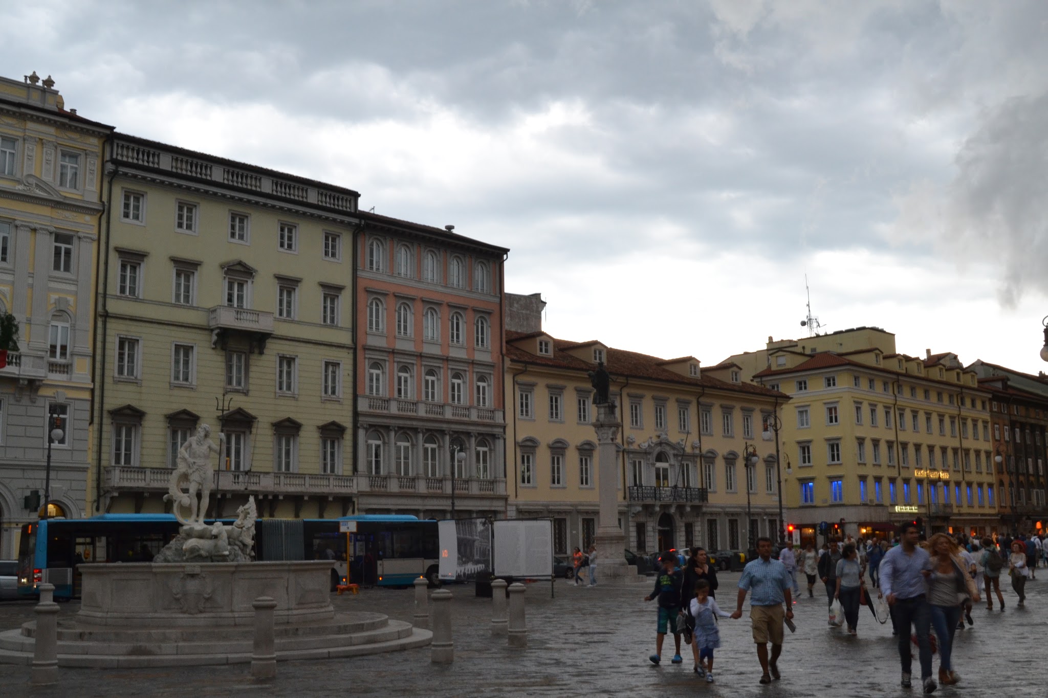 Our professor took us on a historical trip through his city of Trieste last Saturday. We began at 8 in the morning and finished at 8 at night, huddled inside a Serbian Orthodox church with rain battering the stone ceiling and lightning flashing outside the stained glass. By the end, my ankles were ruined, feet stinky as a wet dog, and heart bursting with the pain of history and beauty of the present. We began in Piazza Oberdan.