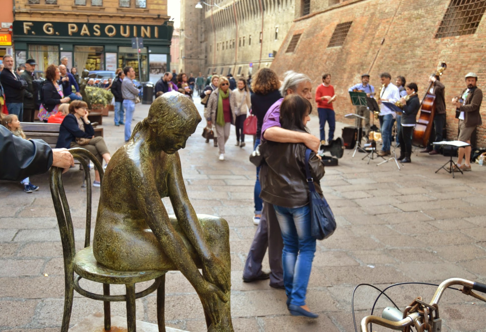 As I was walking off the copious amounts of food from Bolognese cuisine, I did plenty of people watching. The city seems to be made of brick. There are covered promenades, some with frescoes. Cheeses and cured meats are offered in tiny storefronts. It was the home of Europe’s first university in the 11th century, with alumni like Dante Alighieri and Copernicus.