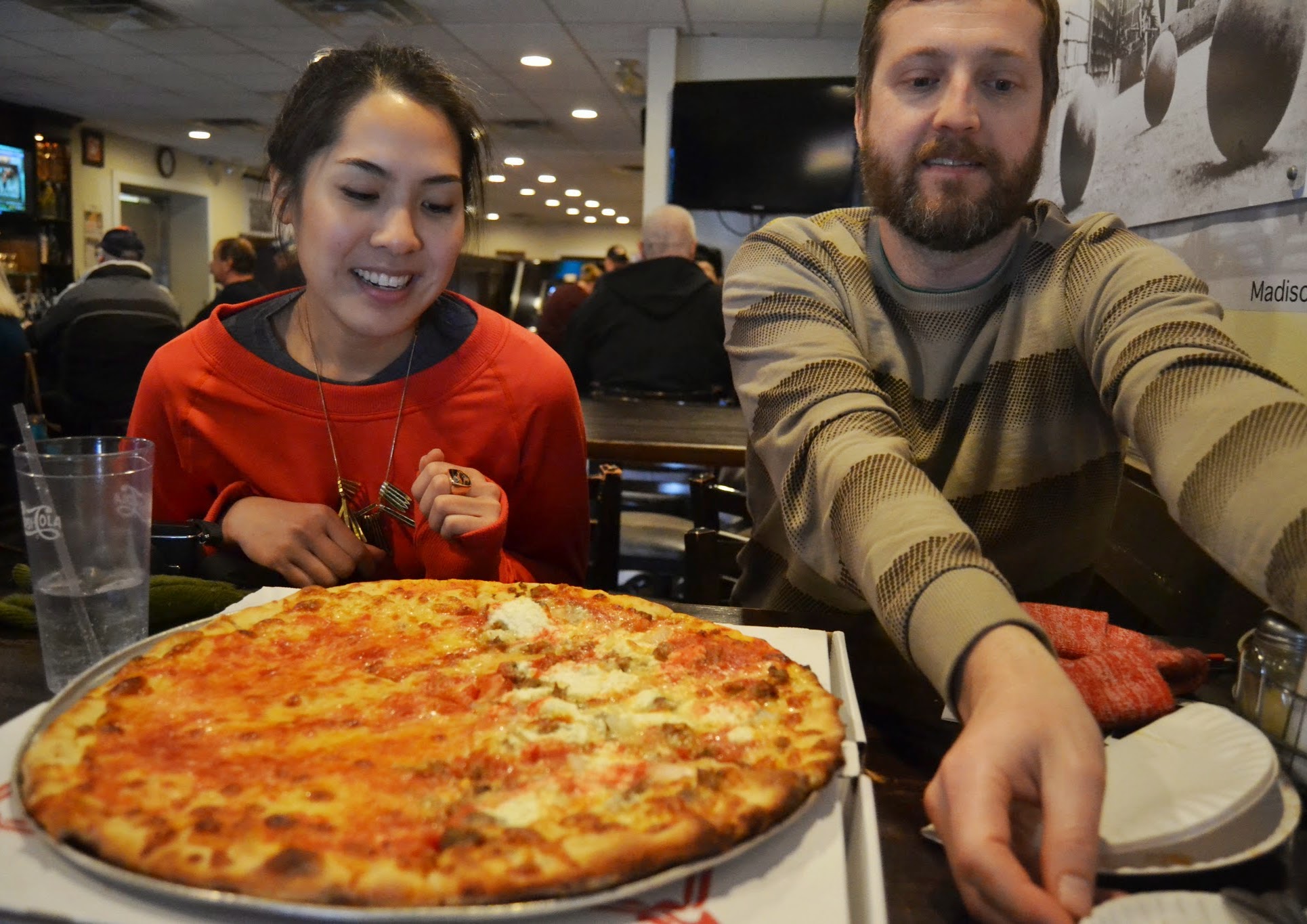Heading to Denino’s (524 Port Richmond Ave.) we were surprised at the staff’s friendliness here. They asked us about our plan for the day and offered tips. Their slogan is “In Crust We Trust” and rightly so, as the crust is uniformly crunchy and fantastic. We ordered a half cheese and half M.O.R. (meatball, onion, ricotta). Those ingredients are a potent and patently palatable combination. We loved this place with their cheerful servers, jukebox ambience and tasty food. A recurring theme of smiles surrounding a pizza begins~~~~
