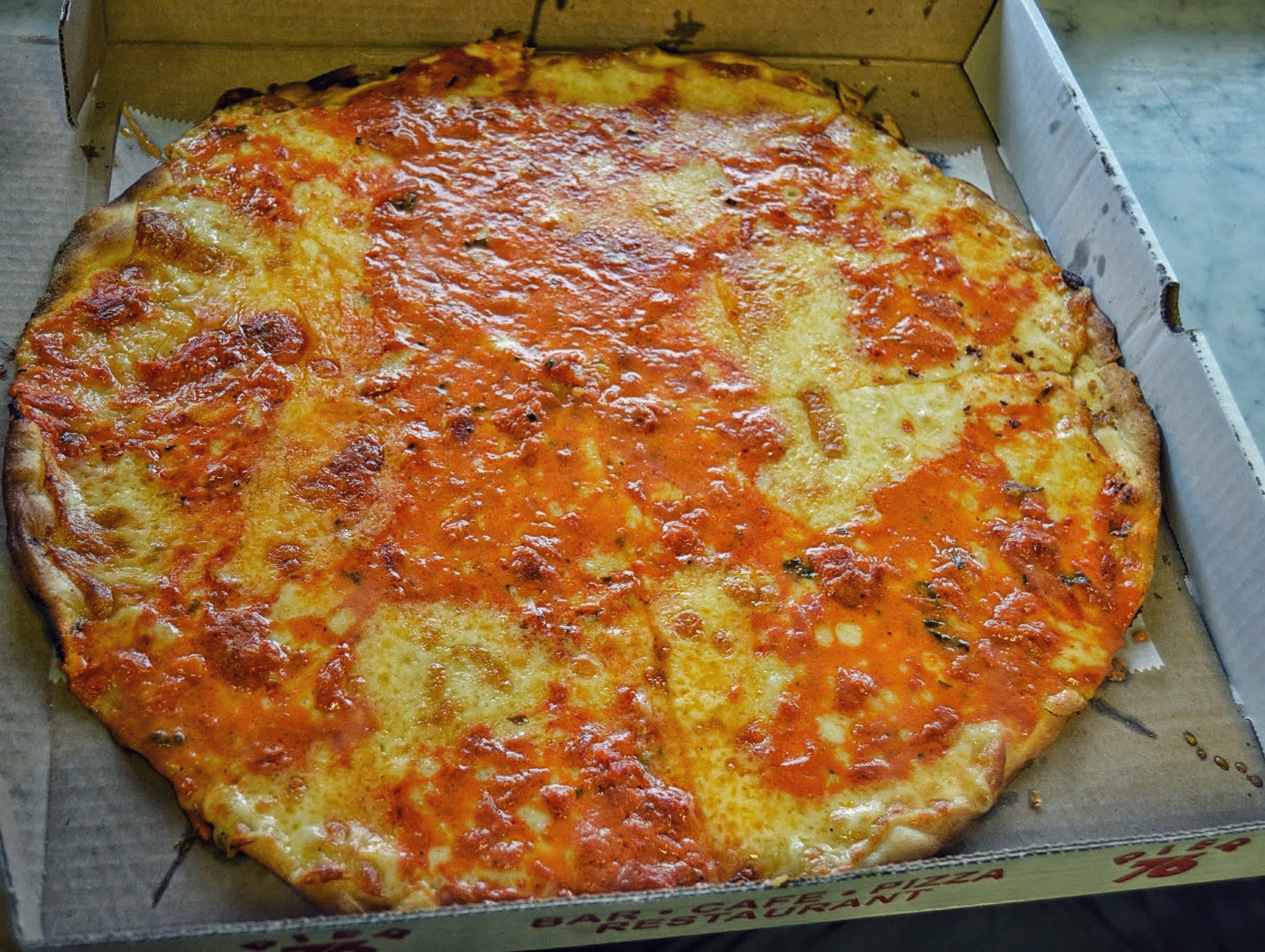 We moved north to Joe & Pat’s (1758 Victory Blvd.) where pictures inside were proibito. The pizza wasn’t ruined by a manager’s sour attitude. Their cheese had some delicious, aged quality we couldn’t identify. The dough was very flimsy in the middle and hard to handle, still good though.