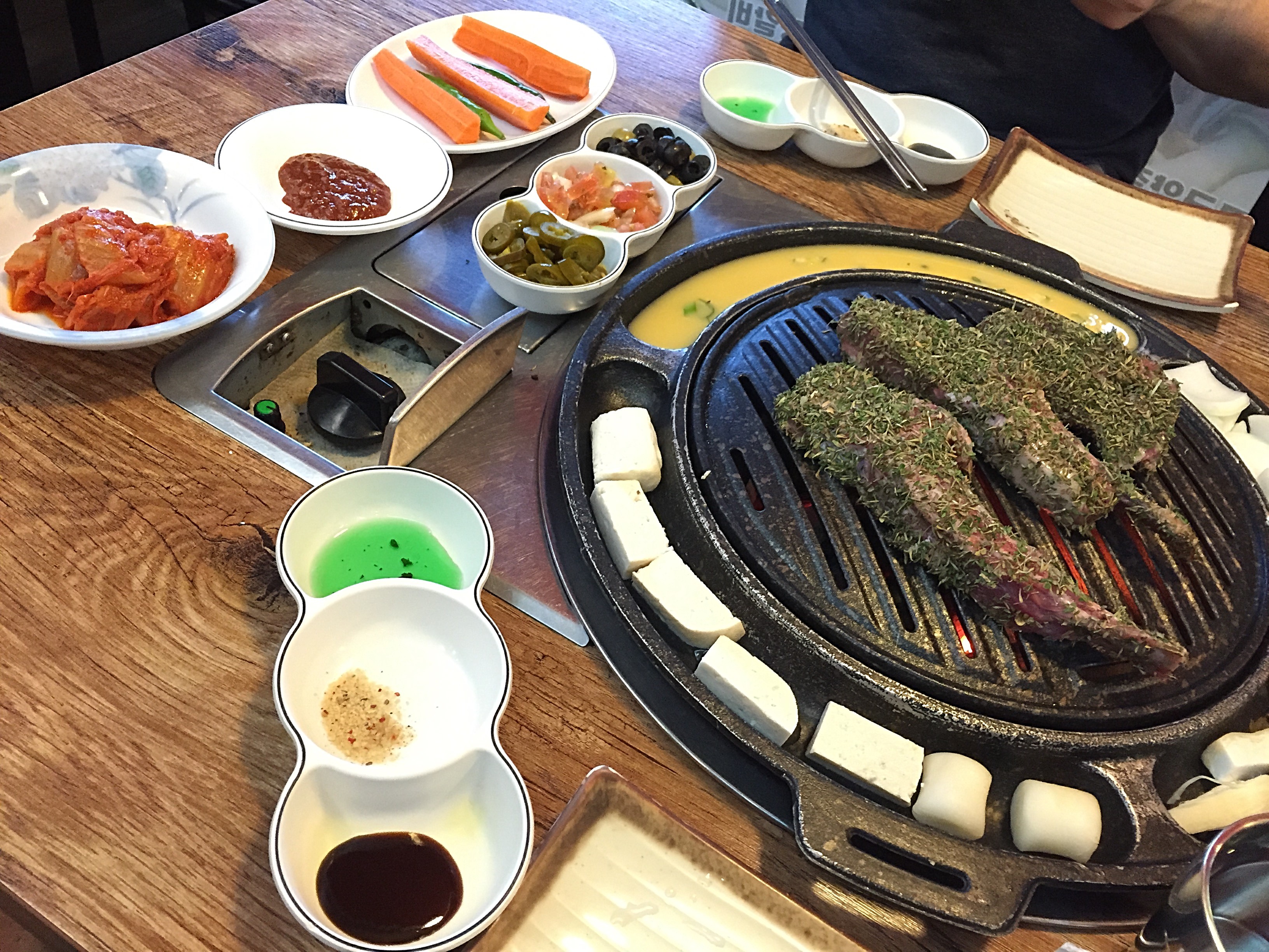 It’s deep into the sticky Korean summer. High humidity and heavy heat keep us sweating in or out of the air/con. We begin with some lamb-chops. Dusted with rosemary seasoning and very juicy, a bottle of soju and some cold beers sooth jangled nerves.