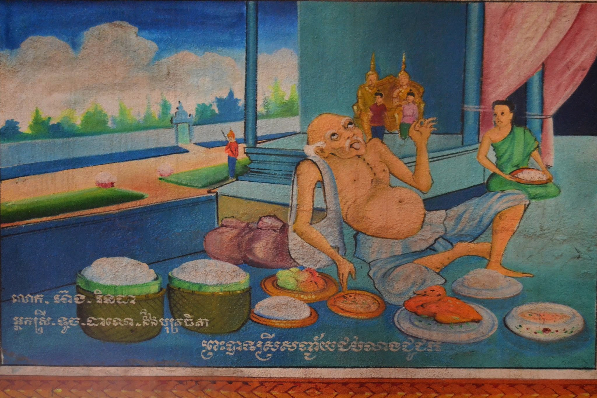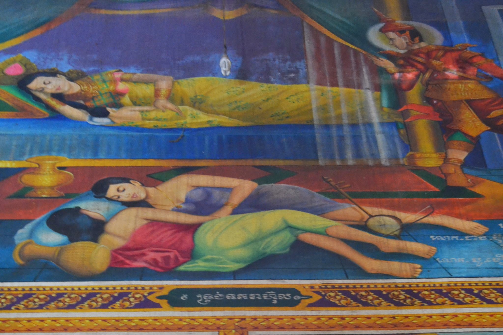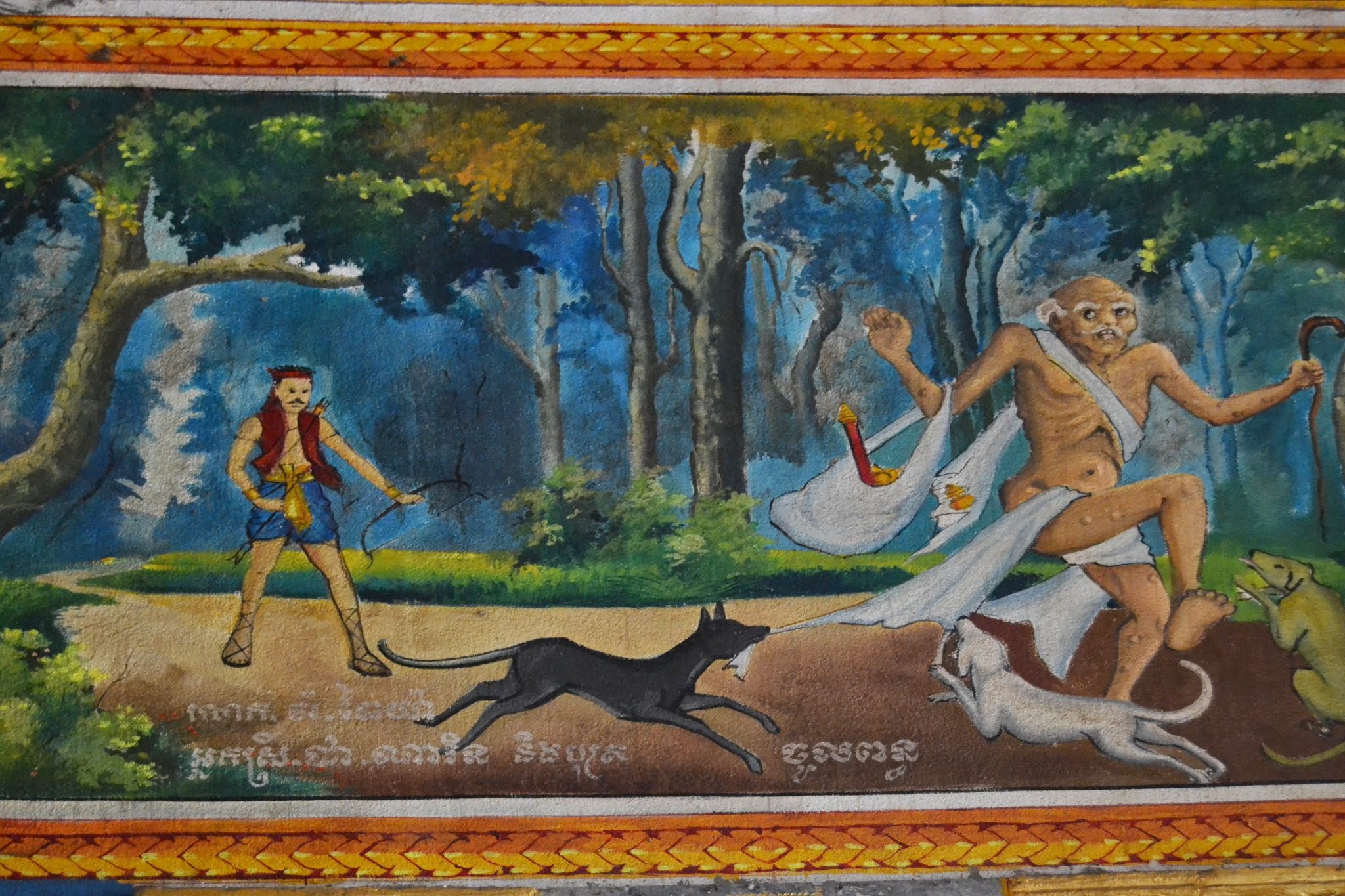 After the expected anti-climax of the dolphins, we popped back on the motorbike for a long drive past the clapboard houses and jungle of Cambodia, and reached a rather nondescript temple. Inside was a different story. I am well acquainted with the mythology of Christianity and probably could tell you the 12 Stations of the Cross and recite the Beatitudes and the 10 Commandments, but I don’t know much about true practicing Buddhists or Hindus. These pictures told fascinating stories that I didn’t know, but am happy to invent.